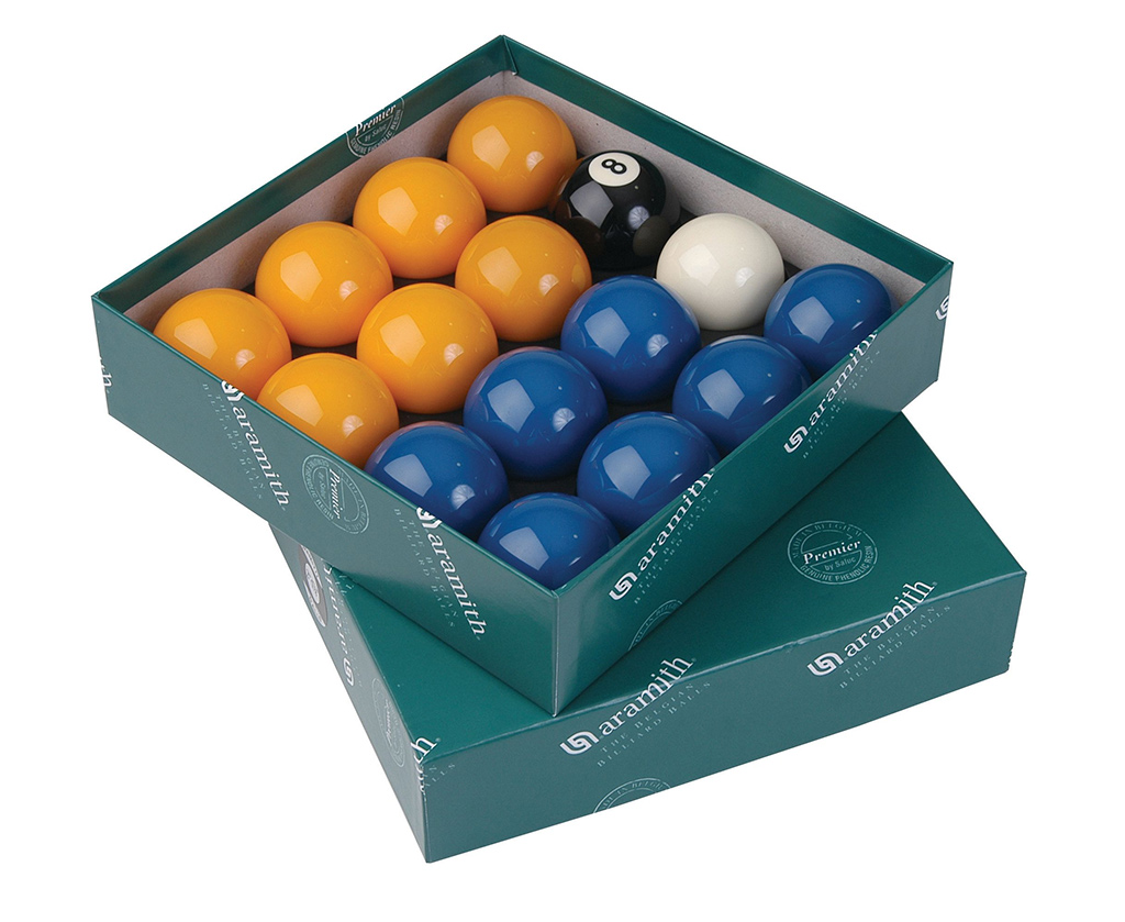 Aramith League Pool Balls with 2-inch diameter Reds & Yellows (and a 1 and 7/8 inch cue ball) are amongst the most popular English Pool Balls on the market. Aramith Balls have a solid core construction which use a phenolic resin to ensure homogeneous characteristics in each ball part of the ball throughout. Extremely efficient in holding their look and with a smoothness that will last and last. Aramith phenolic balls will withstand 50 times more impacts than other polymer or polyester balls. Twice more scratch-resistant than standard balls.
