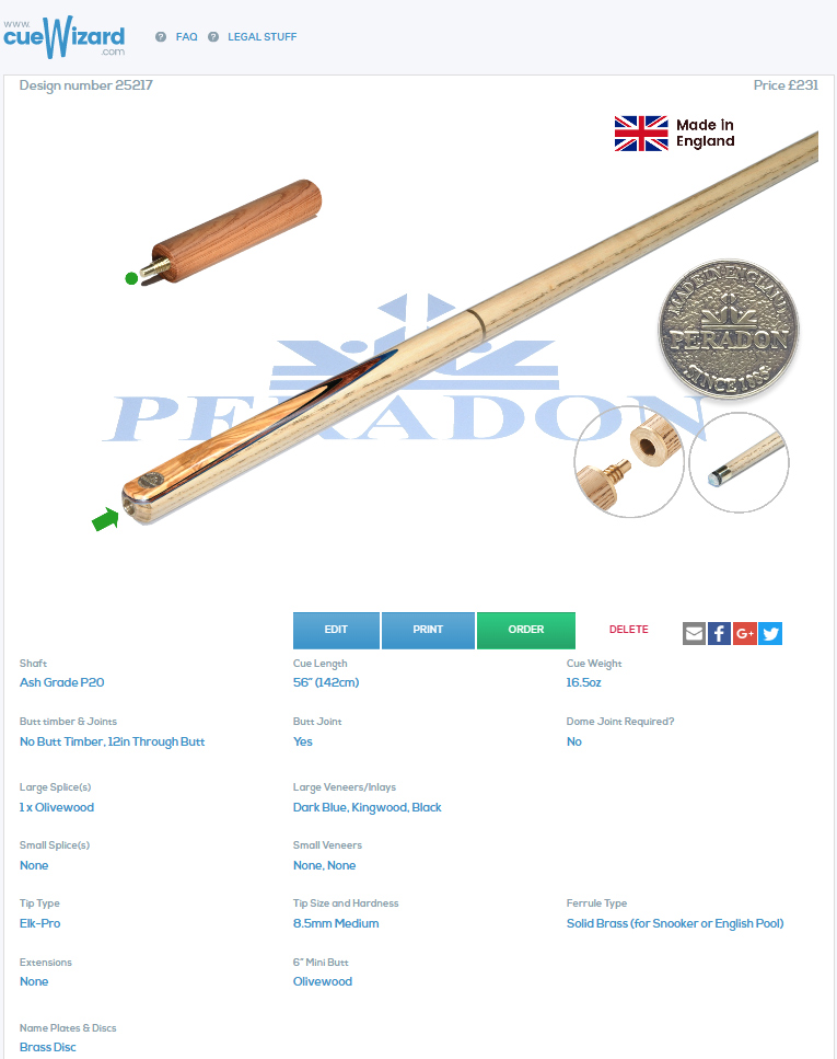 Peradon Custom Cue Wizard - Design Number 25217 with ABC Snooker 10% Discount.