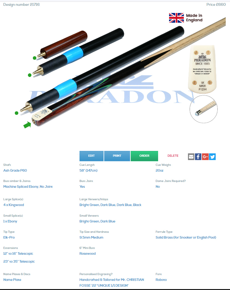 Please note that Peradon Custom Cues take around 5-7 weeks to complete dependant on the complexity of the design required.