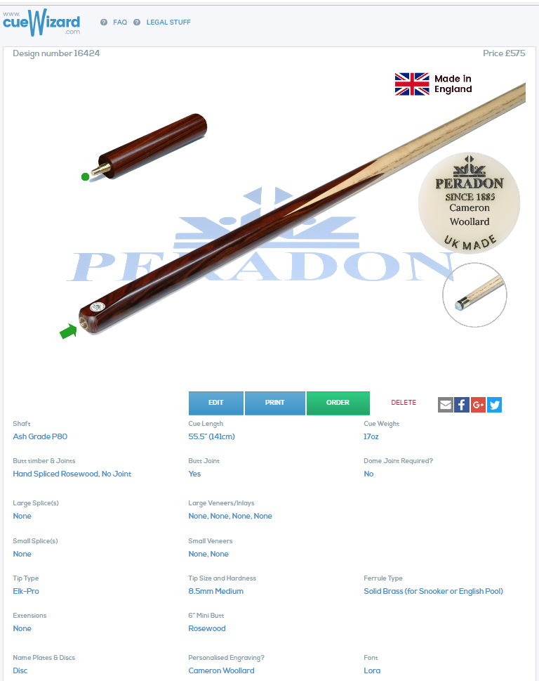 Peradon Cue Wizard Custom Designed Cue Design Number 16424