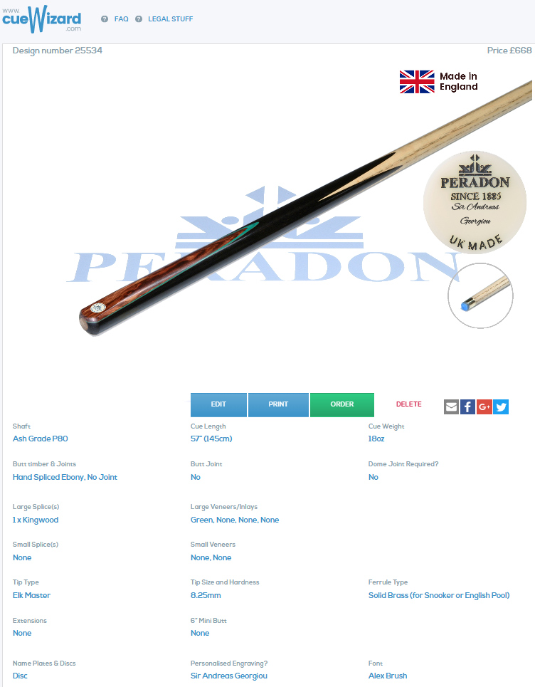 Please note that Peradon Custom Cues take around 5-7 weeks to complete dependant on the complexity of the design required.