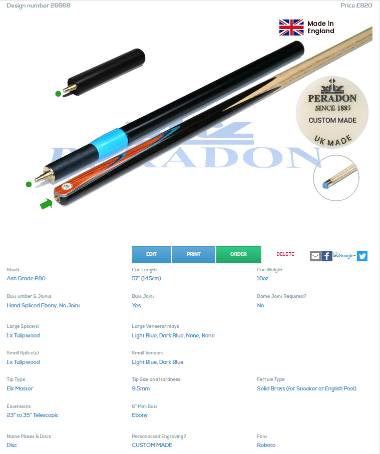 Please note that Peradon Custom Cues take around 5-7 weeks to complete dependant on the complexity of the design required.