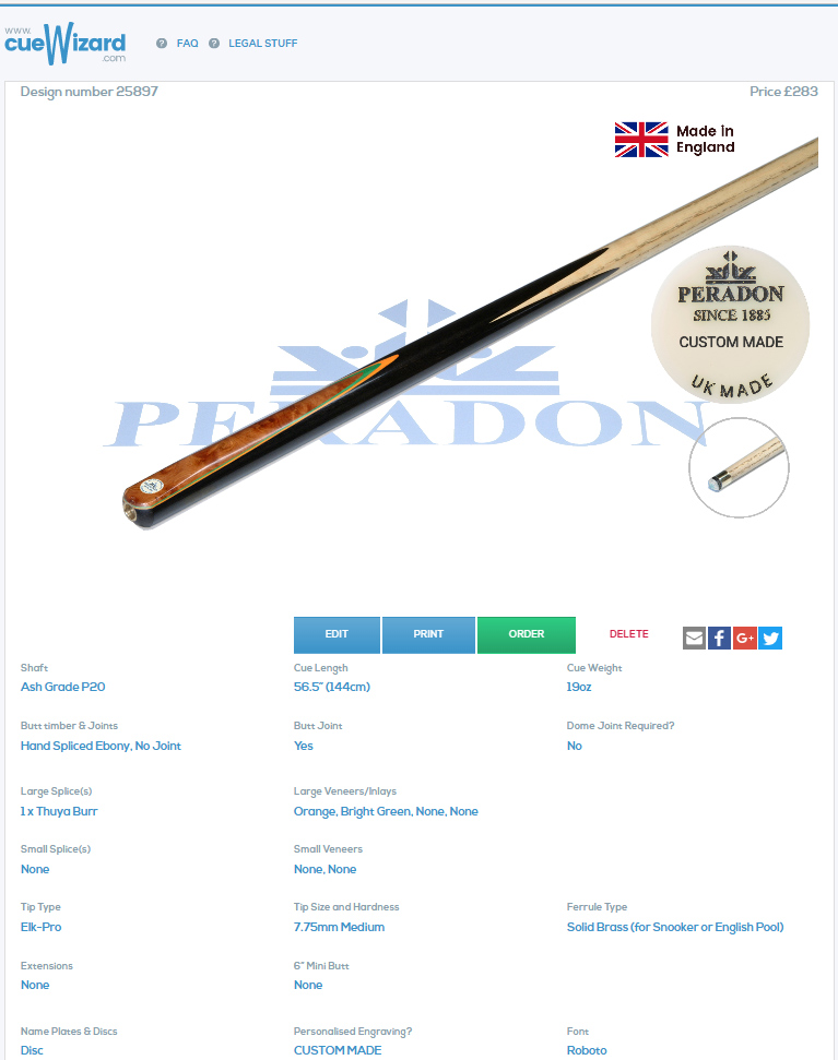 Please note that Peradon Custom Cues take around 5-7 weeks to complete dependant on the complexity of the design required.