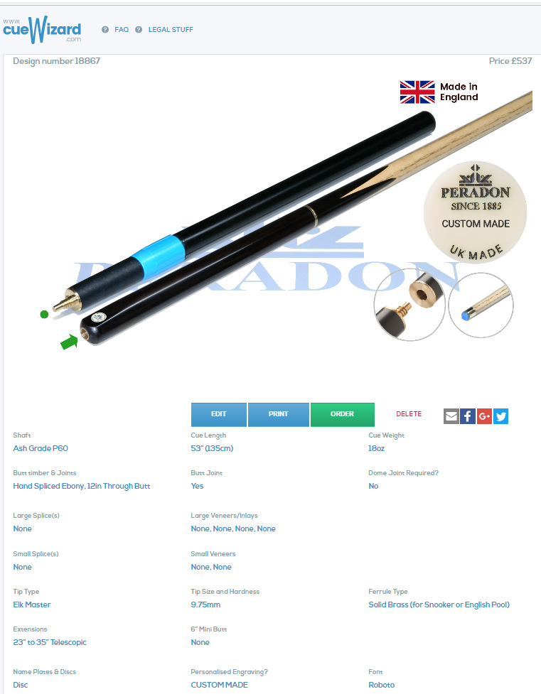 Peradon Cue Wizard custom cue with ABC Snooker 10% Discount