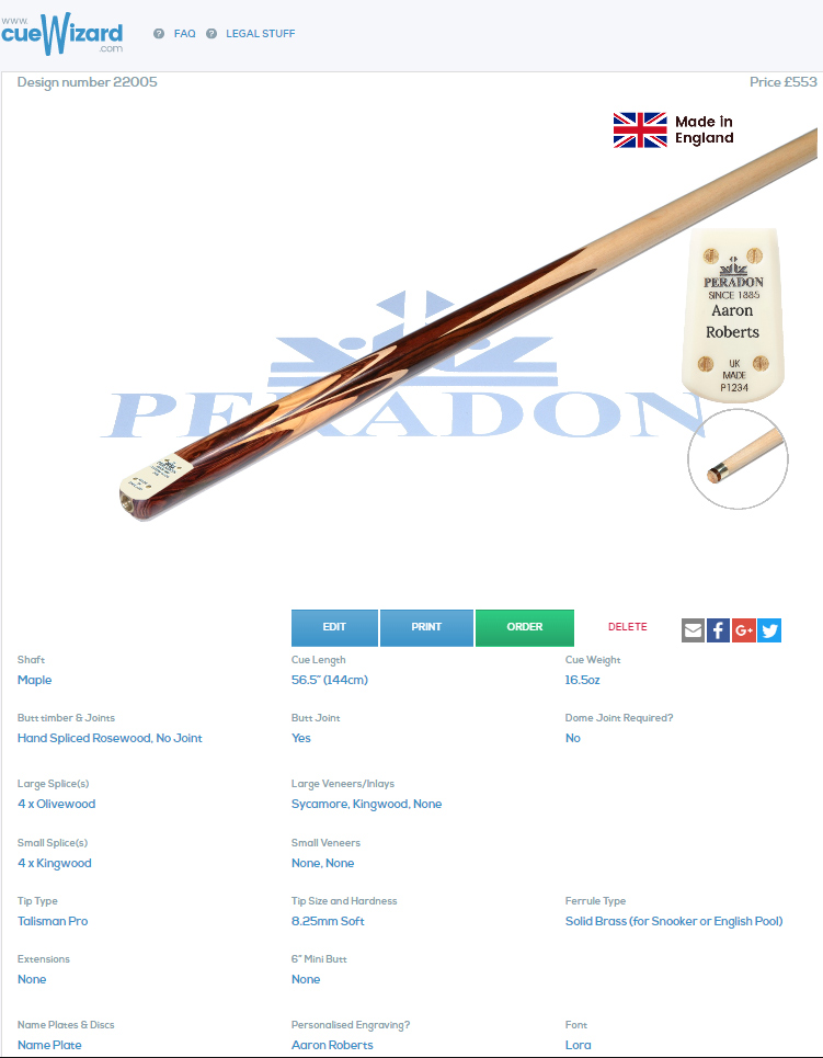 Peradon Cue Wizard Custom Cue Design Number 22005 - Original Price £553.00 - ABC Snooker Price with 10% Discount £497.70