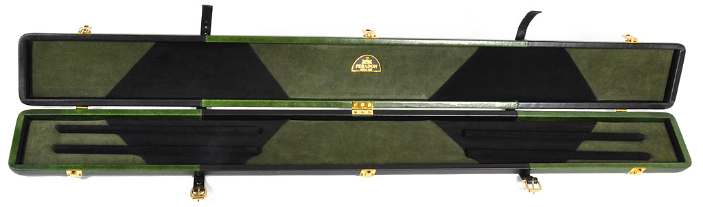 The Deluxe Peradon Black & Green 3/4 Leather Cue Case is hand made and is truly stunning. Whilst many alternative cases may look good in photographs these cases are skillfully constructed by hand down with attention right to the smallest detail. They are constructed as a wooden case which is then beautifully upholstered with the finest quality leather on the exterior and with sued leather on the padded interior which holds the cue in place. The smooth rounded leather case ends are testament to the skill of the case maker. The solid brass hinges and catches are of the highest quality as are the leather straps and buckles. The interior compartments of this case have been cleverly thought out to be much more versatile than most other cases, whilst keeping the length to a minimum. The case will hold a cue with a shaft length up to 47” and along with the butt section will hold additional extensions and butt end extensions. Alternatively the case can also be used to carry two cues without extensions. For details of the compartment sizes please see the chart below. We recommend that you measure the length of your cue including any protruding joints to ensure they will fit. If you are considering purchasing in conjunction with a cue offered by Peradon details of all cue shaft, butt and extension lengths can be found on this website. The exterior of the case is embossed with the distinctive Peradon trademark.