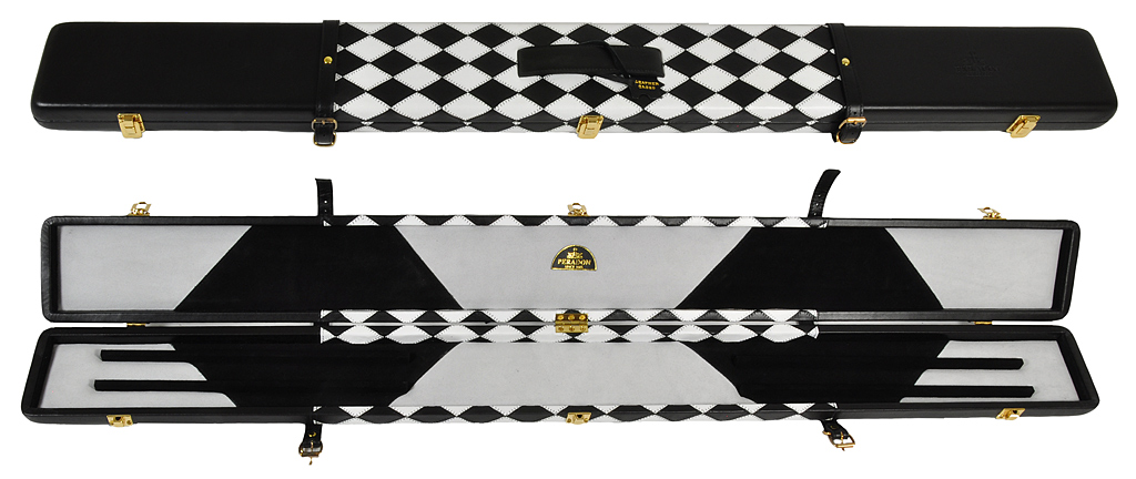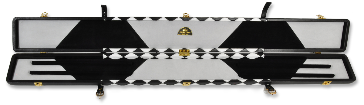 The Deluxe Peradon Black & Small White Diamonds 3/4 Leather Cue Case is hand made and is truly stunning. Whilst many alternative cases may look good in photographs these cases are skillfully constructed by hand down with attention right to the smallest detail. They are constructed as a wooden case which is then beautifully upholstered with the finest quality leather on the exterior and with sued leather on the padded interior which holds the cue in place. The smooth rounded leather case ends are testament to the skill of the case maker. The solid brass hinges and catches are of the highest quality as are the leather straps and buckles. The interior compartments of this case have been cleverly thought out to be much more versatile than most other cases, whilst keeping the length to a minimum. The case will hold a cue with a shaft length up to 47” and along with the butt section will hold additional extensions and butt end extensions. Alternatively the case can also be used to carry two cues without extensions. For details of the compartment sizes please see the chart below. We recommend that you measure the length of your cue including any protruding joints to ensure they will fit. If you are considering purchasing in conjunction with a cue offered by Peradon details of all cue shaft, butt and extension lengths can be found on this website. The exterior of the case is embossed with the distinctive Peradon trademark.