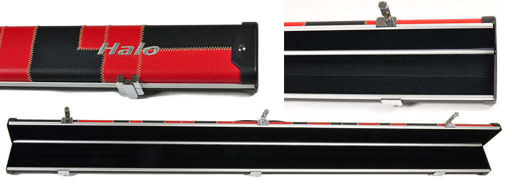 The hinge on the Peradon Halo Red-Black-Patch Leather Effect 3/4 Cue Case is an integral part of the shape of the case making it extremely robust. The catches are of the highest quality with a highly polished chrome finish. The interior is black flocked foam to hold the cue securely in place.